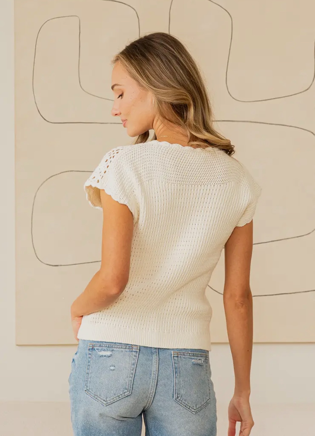 This crochet knit top is the perfect blend of sweet and chic. It features a delicate floral crochet yoke and scalloped neckline that adds a touch of vintage charm. The textured knit body offers a flattering fit, making it an effortless choice for both casual and dressy looks.